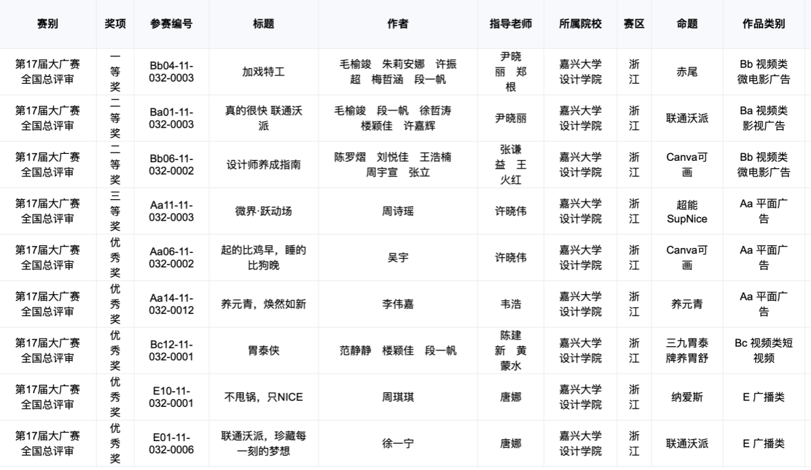 近日,第17届全国大学生广告艺术大赛(大广赛)成绩公布,我院以1个一等奖、2个二等奖、1个三等奖、5个优秀奖的优异成绩刷新全国大广赛历史最佳纪录。此前,学院在第13届浙江省大广赛暨第17届全国大广赛浙江赛区比赛中荣获7个一等奖、4个二等奖、8个三等奖的优异成绩刷新省赛历史最佳纪录。两次大赛的优异成绩充分展现了学院在设计教育与创新实践领域的卓越实力与影响力。